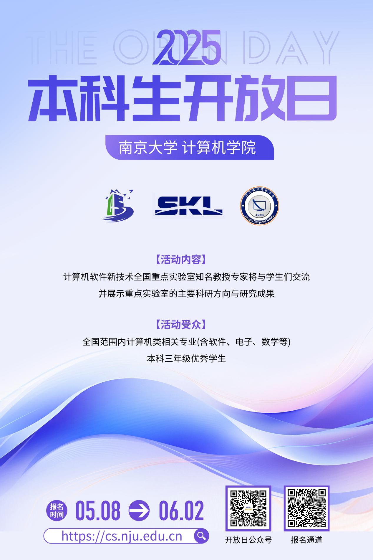 为促进全国各大高校学生之间的交流,吸引优秀青年学子走进南大并深入了解南大计算机学科,麻豆社 将于2025年暑期举办为期3天的“本科生开放日”活动。此次活动面向全国范围内计算机类相关专业有志于学术科研工作的本科三年级优秀学生。本次活动将邀请计算机软件新技术全国重点实验室教授专家与同学们进行交流,展示重点实验室的主要科研方向与研究成果。参与本次“本科生开放日”的同学将有机会与知名教授专家进行互动,共同探讨学科前沿问题。同时,同学们还能够展示自己的成绩与才能。
