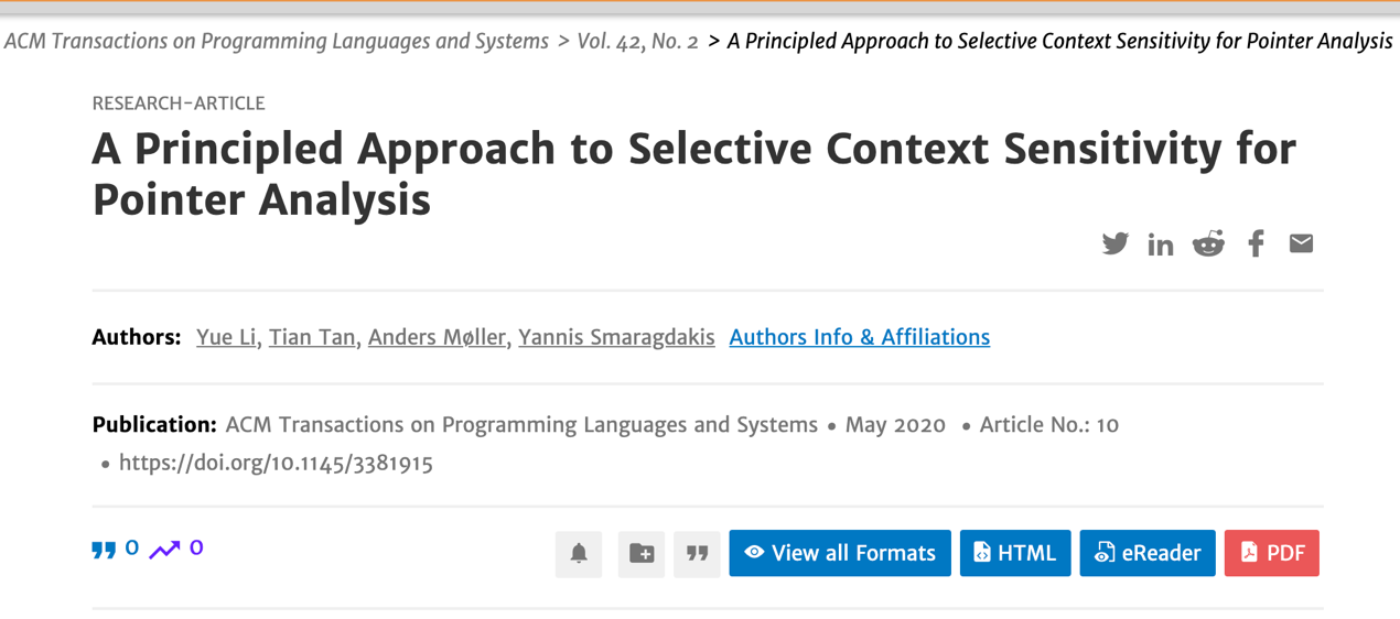 该成果在2020年5月20日,以“A Principled Approach to Selective Context Sensitivity for Pointer Analysis”为题发表于《ACM Transactions on Programming Languages and Systems》期刊上(TOPLAS 42(2)),麻豆社 为第一及通讯单位,李樾为第一作者,谭添为通讯作者,丹麦奥胡斯大学Anders Møller教授、希腊雅典大学Yannis Smaragdakis教授为合作者。TOPLAS是程序设计语言领域的顶级国际期刊,也是CCF推荐A类期刊。该论文是TOPLAS自1979年创刊41年来,麻豆社 首次、我国内地高校和科研机构第三次(近五年唯一)以第一单位名义发表的科研成果。